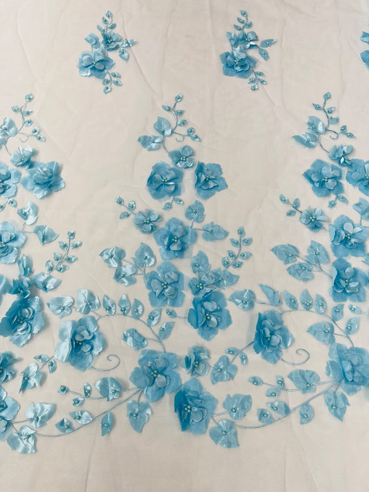 LT BLUE - 3D Floral Design Embroider and Beaded With Rhinestones On a Mesh Lace. Sold By The Yard. - For Bridal Weddings Prom & Quinceanera