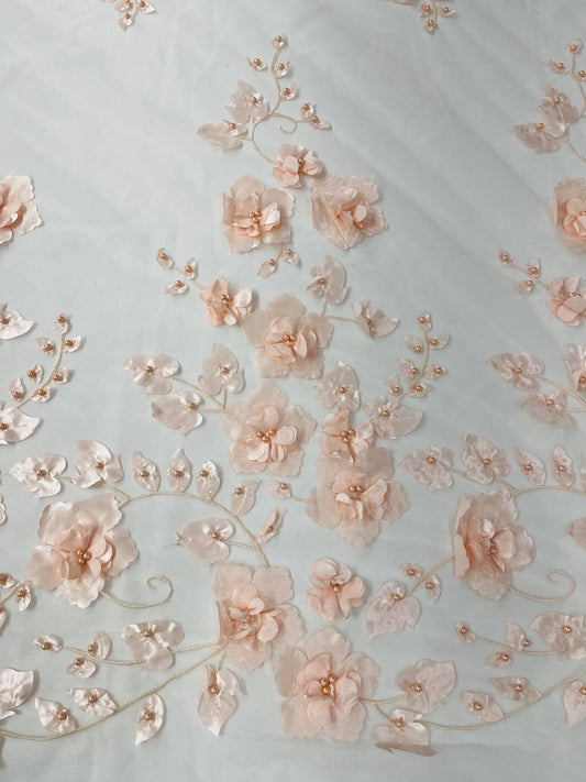 BLUSH PEACH - 3D Floral Design Embroider and Beaded With Rhinestones On a Mesh Lace. Sold By The Yard. - For Bridal Weddings Prom & Quinceanera