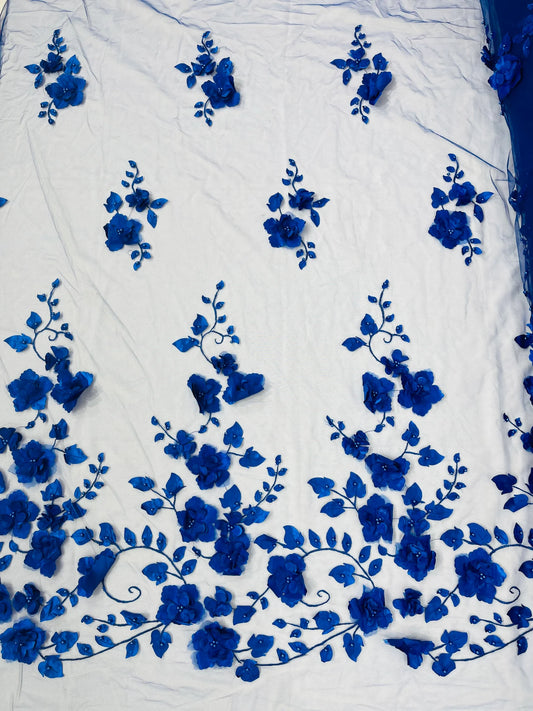 ROYAL BLUE - 3D Floral Design Embroider and Beaded With Rhinestones On a Mesh Lace. Sold By The Yard. - For Bridal Weddings Prom & Quinceanera